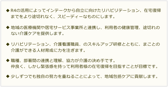 「老健施設に求められる使命」をはっきりと自覚して、新たな介護を実践しようと考えています。