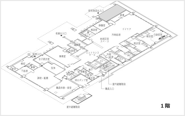 玄関を入るとまず正面に2基のエレベーター、右手に受付/事務室、ロビーから左側に、地域交流スペース、相談室、デイフロア、浴室が配置されています。職員の出入り口は建物の裏側で、更衣室、厨房、職員食堂などが配置されています。