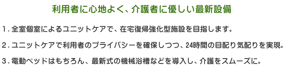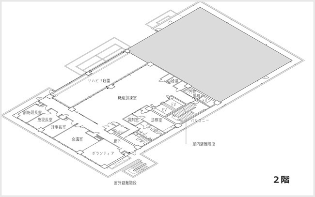 機能訓練室、リハビリ庭園、診察室、施設長室、応接室、会議室などがあります。